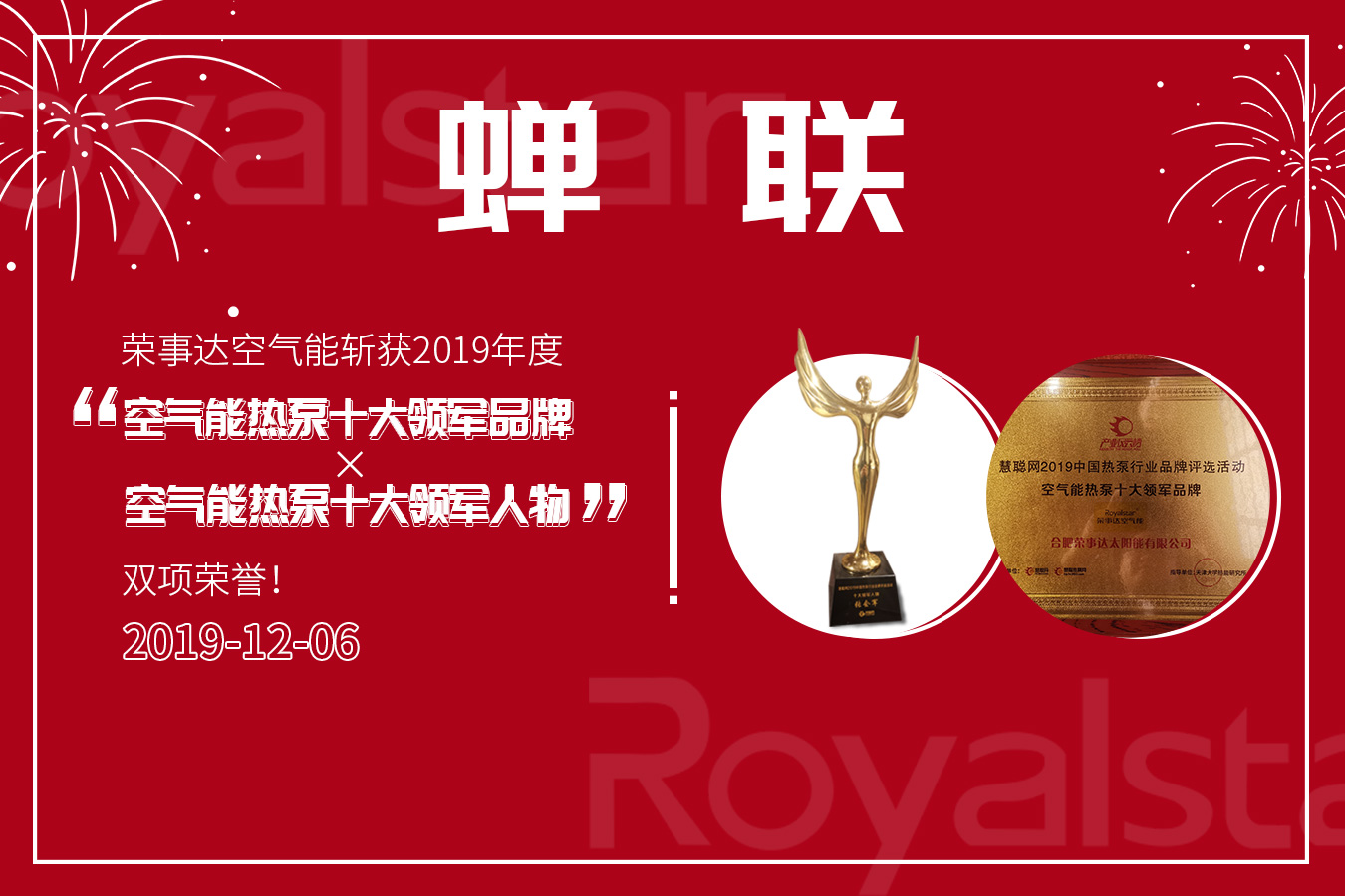 蝉联!荣事达空气能斩获2019年度“空气能热泵十大领军品牌”“空气能热泵十大领军人物”双项荣誉!