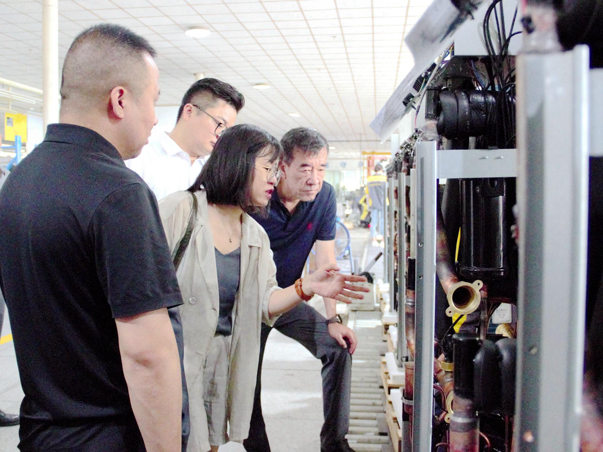 从侧门出服务平台,映入眼帘的便是荣事达空气能工厂。荣事达空气能工厂负责人白礼鹏对领导们的到来表示热烈欢迎,陪同一行人重点参观工厂自动化生产线以及超低温实验室的运作。